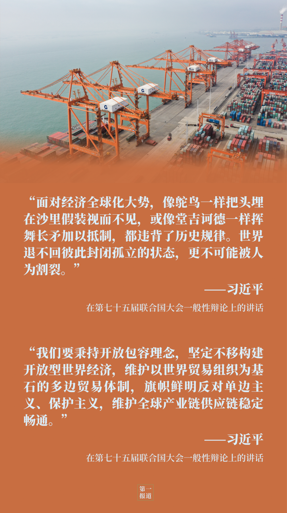 在联合国“云讲台”,习主席还向国际社会生动阐释了中国“新发展格局”与构建开放型世界经济、推动全球经济复苏的关系:“我们不追求一枝独秀,不搞你输我赢,也不会关起门来封闭运行,将逐步形成以国内大循环为主体、国内国际双循环相互促进的新发展格局,为中国经济发展开辟空间,为世界经济复苏和增长增添动力。”