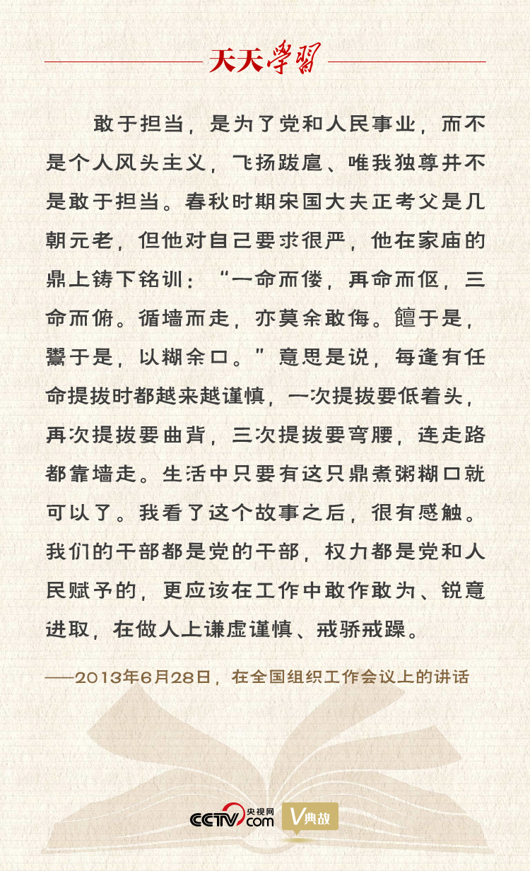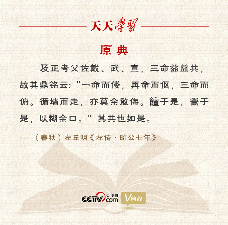 上面这条典故文字佶屈聱牙,习近平总书记在引用时进行了生动通俗的阐释,告诫党员领导干部要像正考父一样严格要求自己,把位置放低,少些自满,多些干劲。