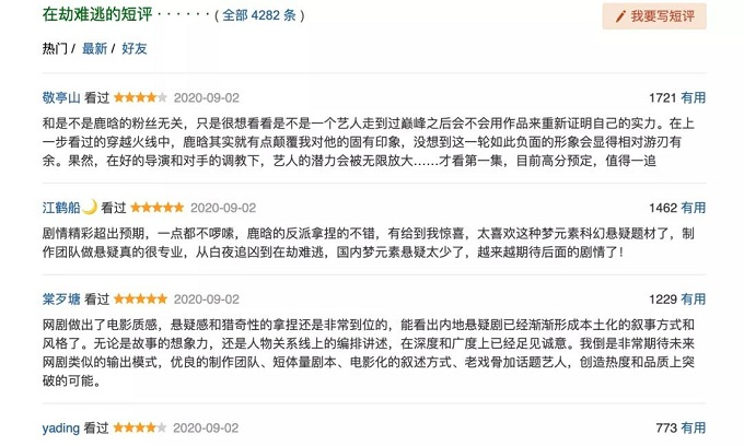 在尚未开分的豆瓣评分网站,《在劫难逃》排名靠前的评论均为四星以上。