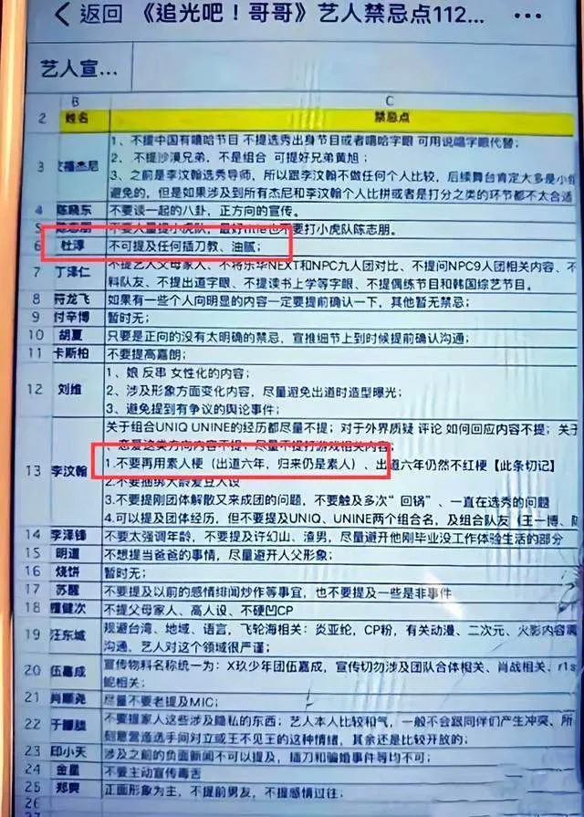 这两天,一张《追光吧哥哥》艺人禁忌点图片在社交平台上不断流传,最终登上了微博热搜。这些本该被掩在台面下的潜规则被掀开,击了大众的窥私欲,更丰富了吃瓜群众们调侃明星的词汇库。