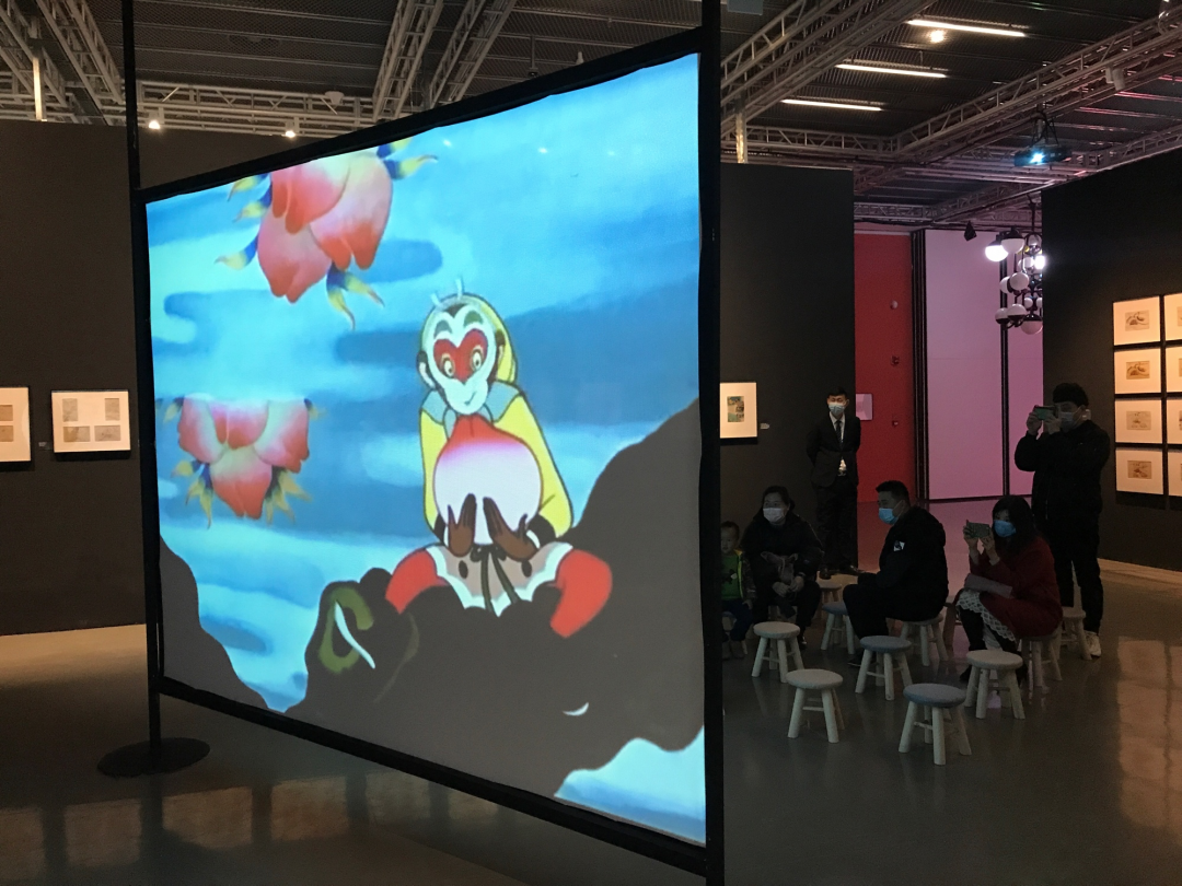 展览展出了大量张光宇创作于上世纪六十年代的《大闹天宫》美术设计手稿,现场播放的动画片也将观众的思绪带回了童年。好多观众坐在投影幕布前观看,久久不愿离开。