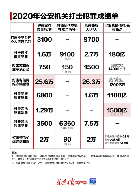 2020年,全国公安机关紧紧围绕“坚决遏制跨境赌博犯罪乱象”的目标,会同有关部门全力开展打击治理专项工作。截至12月底,共破获各类跨境赌博案件3500余起,抓获犯罪嫌疑人7.5万余名,打掉涉赌平台2260余个、非法技术团队980余个、赌博推广平台1160余个,打掉非法支付平台和地下钱庄1960余个。