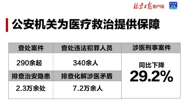 各地公安机关共查处各类扰乱医疗救治秩序案件290余起,查处扰乱医疗救治秩序违法犯罪人员340余人,排查整改医疗机构治安隐患2.3万余处,排查化解涉疫涉医矛盾纠纷7.2万余起,涉医刑事案件同比下降29.2%。
