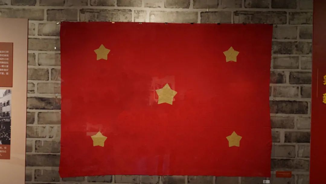 他们用红色的绣花被面和泛黄的草纸为材料,用剩饭当浆糊在被面上,凭借想象,将一颗大星贴在中央,四颗小星贴在四个角落,旗帜做好后,藏在牢房角落一块松动的地板下面。