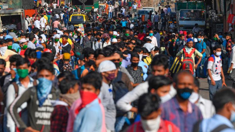 印度全国范围的封锁期间,工人聚集在达拉维贫民窟外等待搭乘巴士回家。图片来源:美国有线电视新闻网