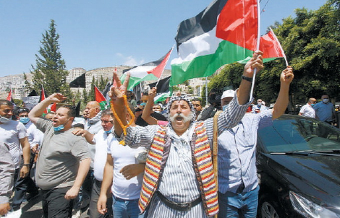 8月14日,巴勒斯坦人在约旦河西岸城市纳布卢斯抗议以色列与阿联酋达成的和平协议。新华社发