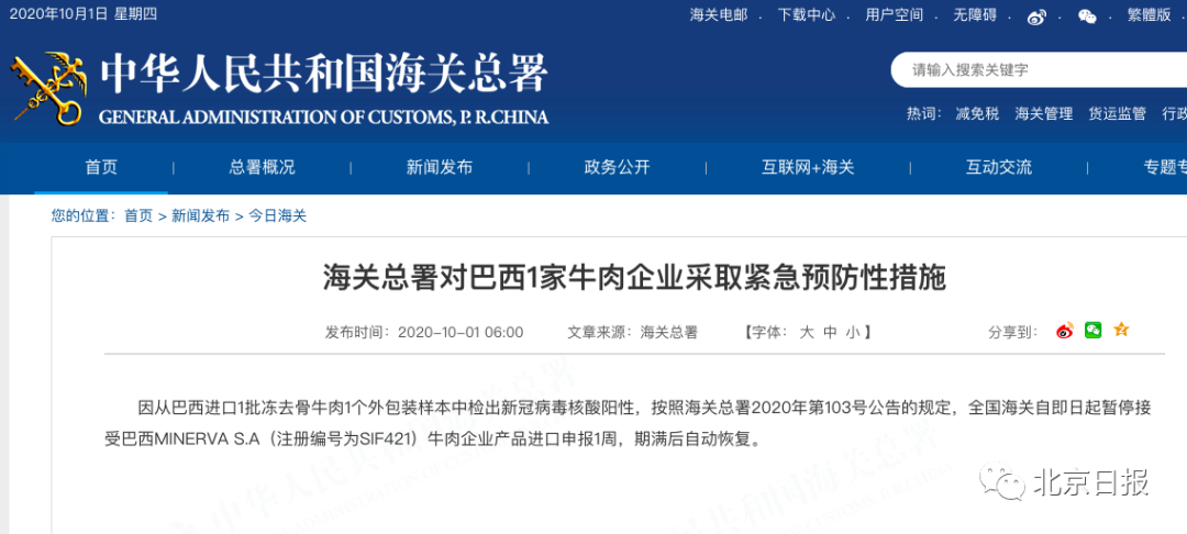 据海关总署官网10月1日消息,因从巴西进口1批冻去骨牛肉1个外包装样本中检出新冠病毒核酸阳性,按照海关总署2020年第103号公告的规定,全国海关自即日起,暂停接受巴西MINERVA S.A(注册编号为SIF421)牛肉企业产品进口申报1周,期满后自动恢复。