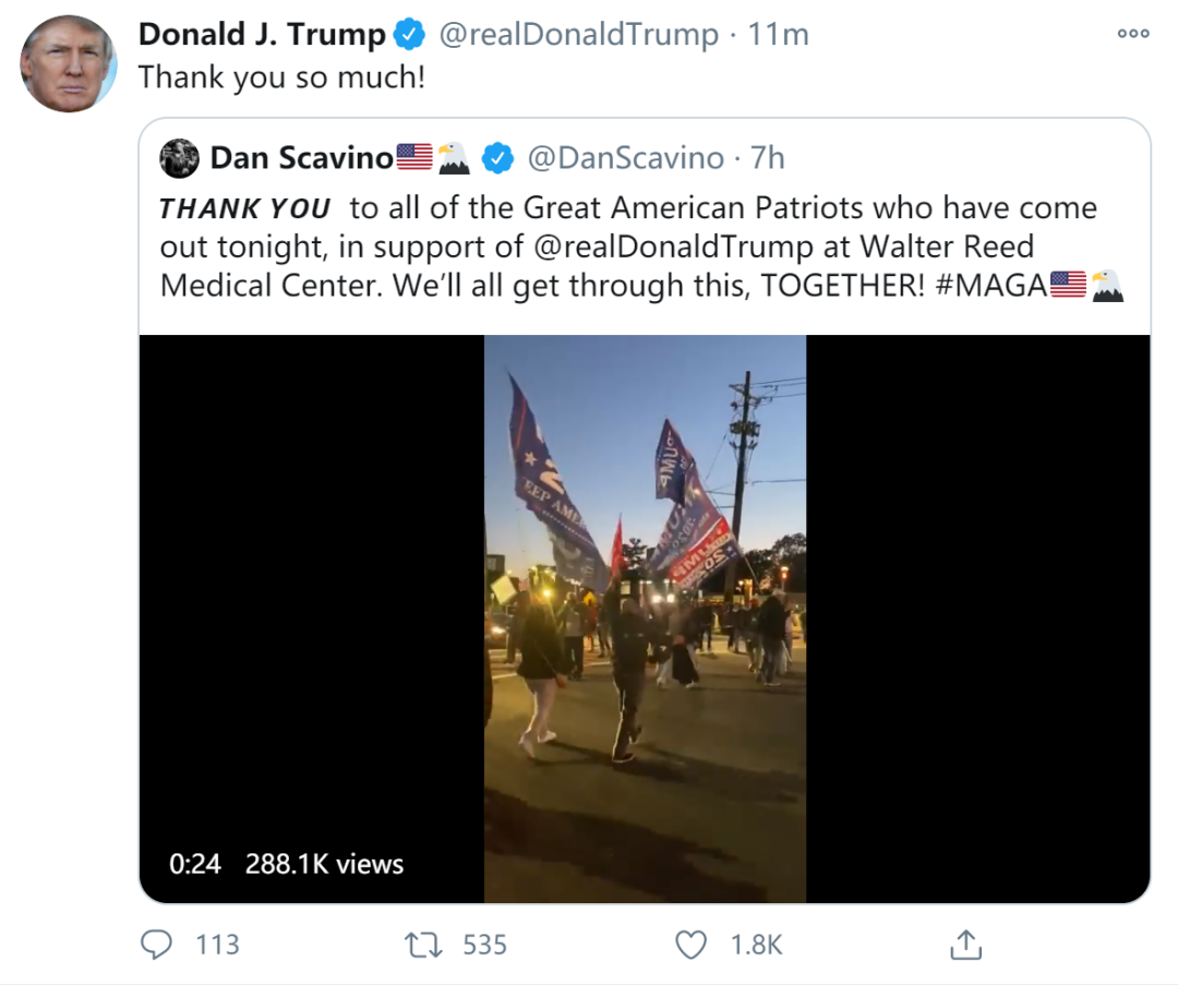 特朗普入住沃尔特·里德国家军事医疗中心后,一群举着美国国旗、“特朗普2020”竞选旗帜的支持者聚集在医疗中心外,表达对总统的支持。对此,特朗普在医院里发推文,表示“非常感谢你们!”
