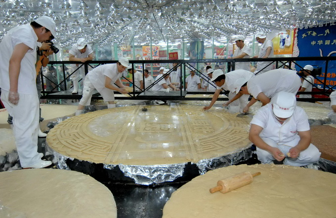 万家团圆之际,当人们手捧袖珍精巧的月饼品尝时,甘肃省武威市民勤县的妇女们正挥汗如雨,用大半袋子面粉、十多种配料和一天一夜的时间,制作大如车轱辘、锅盖的大月饼。