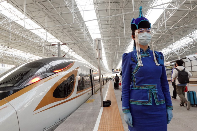 在北京北站,身着蒙古族服饰的列车员站在列车口迎接乘客。