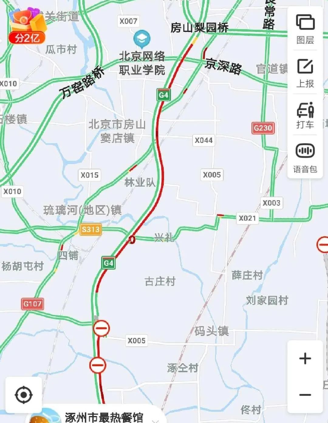 京港澳高速京石段因交通管制,健康城站北京方向关闭。