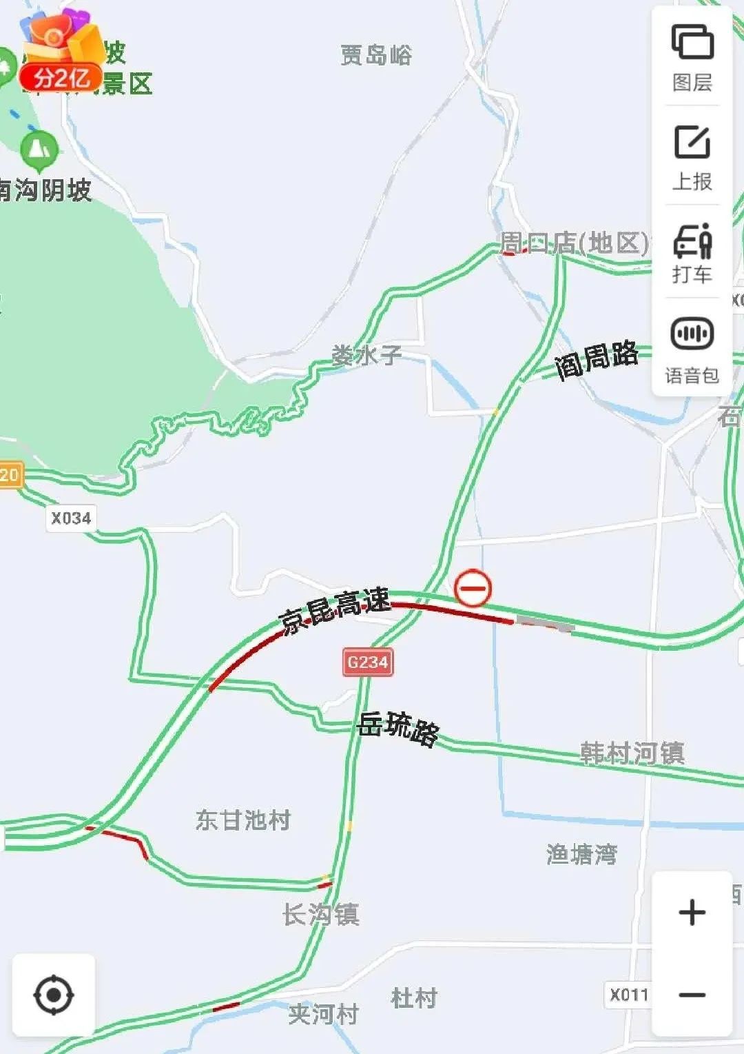 此外,京昆高速受检查站查车影响,进京方向房易路至韩村河车流量大,京昆高速进京方向韩村河出入口匝道临时交通管制。