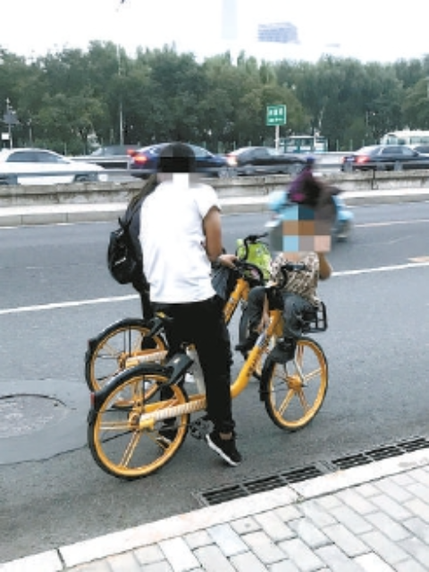 9月21日,在八王坟汽车站附近,一名年轻男子骑着一辆黄色的共享单车,前车筐里坐着一名小男孩,正低着头摆弄车把。反映问题的市民说他举起手机拍摄时,车筐里的孩子发现了他,还向他招了招手。