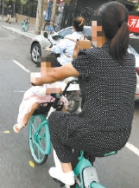 9月初,在红庙路口东侧的人行道上,一位年轻女子骑着共享单车,面前的车筐里坐着一名几岁大的孩子,孩子戴着口罩,两只手紧紧抓着车把。