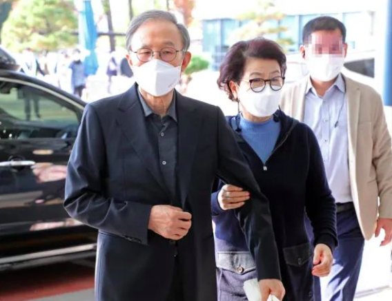 10月30日,李明博在夫人搀扶下去医院(韩联社)