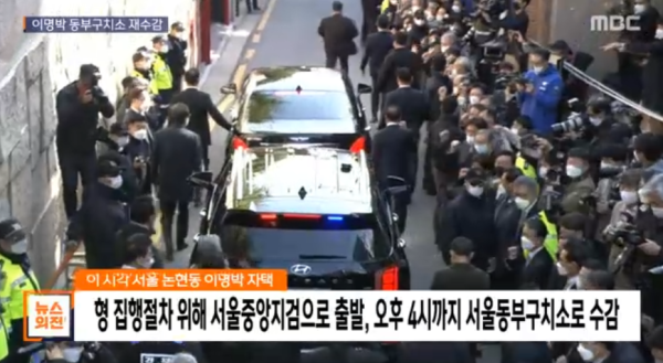 据韩国KBS新闻报道,2日下午,78岁的韩国前总统李明博从家中出发,乘车前往首尔中央地方检察院,在经过身份确认等程序后,他于今天下午4点前被收押在首尔东部看守所,正式服刑。当天李明博家门口聚集大批人群。
