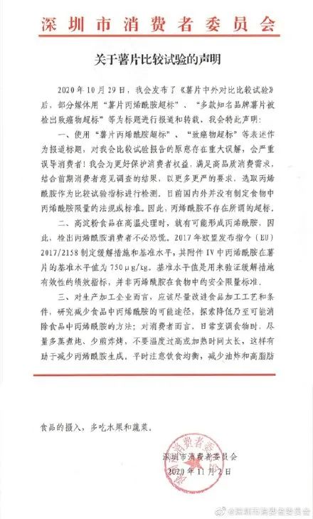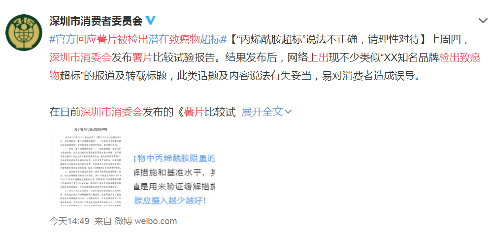 2日下午,@深圳市消费者委员会 发微博称,上周四,深圳市消委会发布薯片比较试验报告。结果发布后,网络上出现不少类似“XX知名品牌检出致癌物超标”的报道及转载标题,此类话题及内容说法有失妥当,易对消费者造成误导。