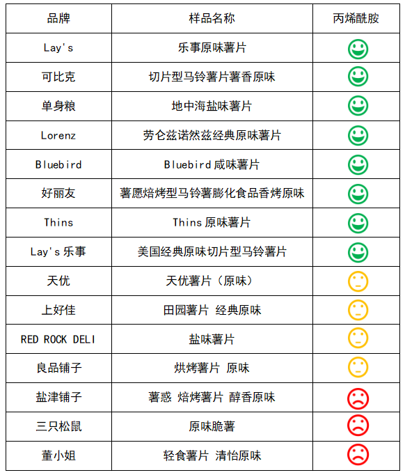多家品牌薯片丙烯酰胺含量较高