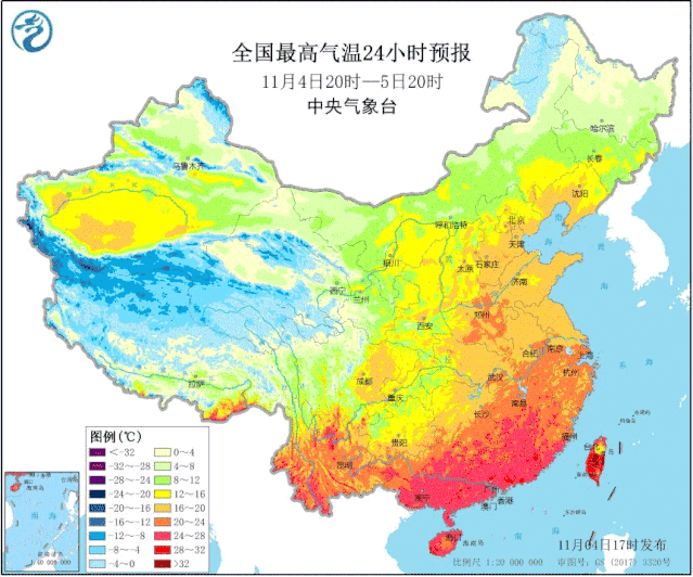 不过新一波冷空气已开始影响新疆,11月4日夜间至7日,长江中下游及其以北大部地区气温将下降4~6℃,其中,内蒙古东南部、东北地区中南部、青藏高原东部等地降温可达8℃以上。