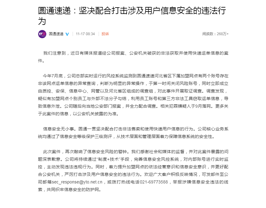 此次案件,再次敲响了信息安全风险的警钟。我们感谢社会和媒体的监督,并对此案件暴露的问题深表歉意。公司将持续通过“制度+技术”手段,完善信息安全风控系统,对内部账号进行实时监控,主动发现违法违规行为。同时,着力提升加盟网点的依法经营意识和信息安全意识,并更好配合公安机关,严厉打击涉及用户信息安全的违法行为。欢迎广大客户积极反映情况,可发邮件至公司邮箱sec_response@yto.net.cn,或拨打热线电话021-69773588,举报涉嫌信息安全违法的线索,共同织牢信息安全的防护网。