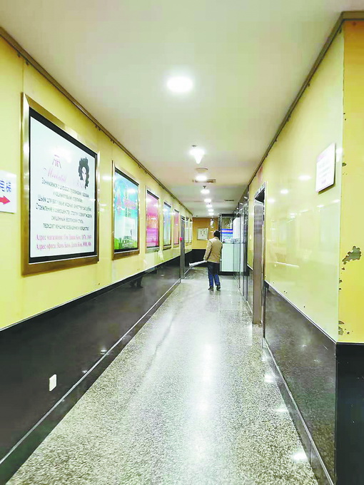 记者近日来到万邦大厦现场探访。只见大厦东侧、北侧开设有彩票站、生鲜超市等店面。见北侧一旋转门上贴有“请走南门”提示,记者绕行大厦西侧,来到大厦南门。南门外是一处地上停车场,穿过停车场,进入大厦,沿东通道北行,记者发现一些贸易公司、宾馆等正在营业。一幅幅有关中医、皮草等内容的巨幅广告张挂在墙壁上。通道左侧有电梯间,记者看到两扇电梯门上也贴着快捷宾馆的宣传广告。