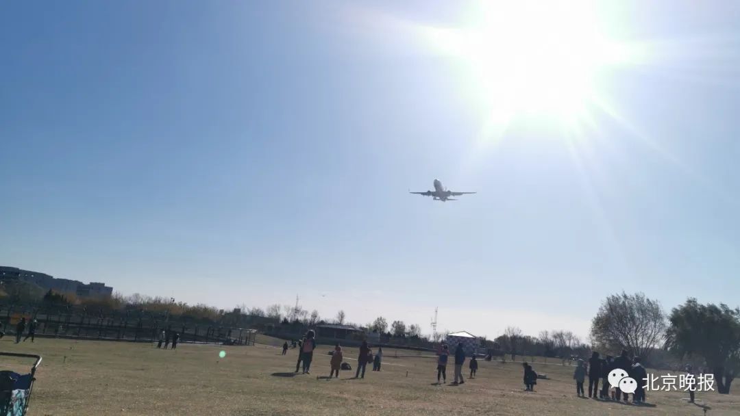 伴随着轰鸣声,南方的天空远远地出现了一个闪亮的小亮点。轰鸣声越来越大,飞机也从一个小点慢慢变大。巨大的机身从人们的头顶缓缓滑过,最后降落到了与公园一网之隔的机场停机坪。不到半个小时,5架飞机从人们头顶飞过。每过一架飞机,公园里便会响起孩子们的欢呼雀跃声。