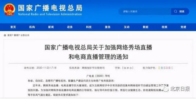 近日,国家广电总局发布《关于加强网络秀场直播和电商直播管理的通知》,专门提出,“切实采取有力措施不为违法失德艺人提供公开出镜发声机会,防范遏制炫富拜金、低俗媚俗等不良风气在直播领域滋生蔓延”。