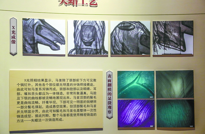 透明的玻璃展柜中,马首的神态栩栩如生,毛发纤毫毕现,色彩深沉厚重,历百年风雨而不锈蚀。外形如此精美的马首是如何铸造而成的?去年,北京大学考古文博学院曾对马首铜像进行了一次“体检”,这份“体检报告”包含表面翻模显微观察、X光成像、内部结构观察等内容,被公布于展板之上。