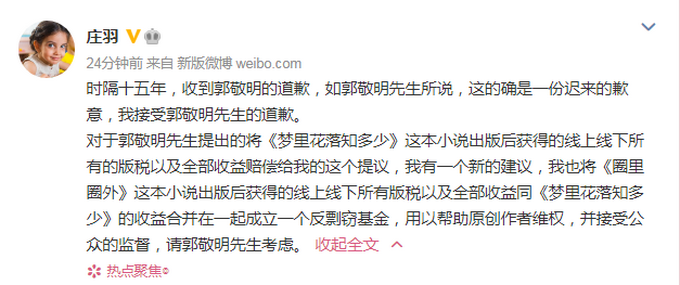 针对郭敬明今日凌晨的致歉,刚刚,庄羽在其微博上回应称接受郭敬明的道歉,希望一起成立一个反剽窃基金,以帮助原创作者维权。全文如下: