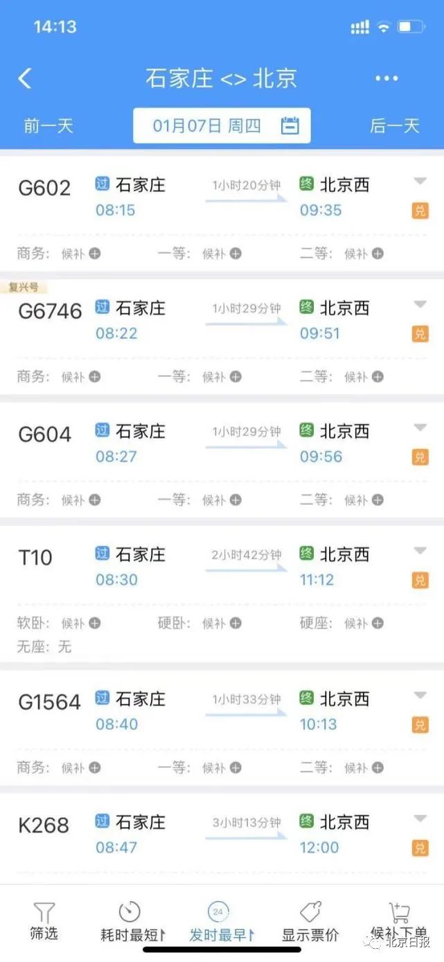 受河北疫情影响,12306现已无法购买石家庄、邯郸、邢台等地至北京的火车票。