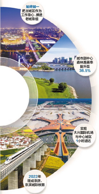 “轨道上的京津冀”——2022年将建成京唐、京滨城际铁路,加快京港台高铁(丰雄商段)建设;依托区域快线和市郊铁路,通过大站快车便利通勤人员出行。