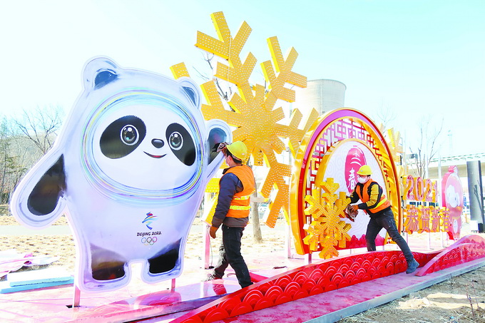 红色祥云,黄色的六瓣雪花,憨态可掬的“冰墩墩”、“雪容融”好像正“招手”欢迎来客……位于首钢园区内冬奥组委门口的春节景观已经组装完毕,施工人员阎清平和陈然正用湿抹布轻轻擦拭着景观造型外层的浮土。“电也通了,等今天晚上一亮灯,这些‘雪花’都是五颜六色的!”阎清平的声音里充满了期待。