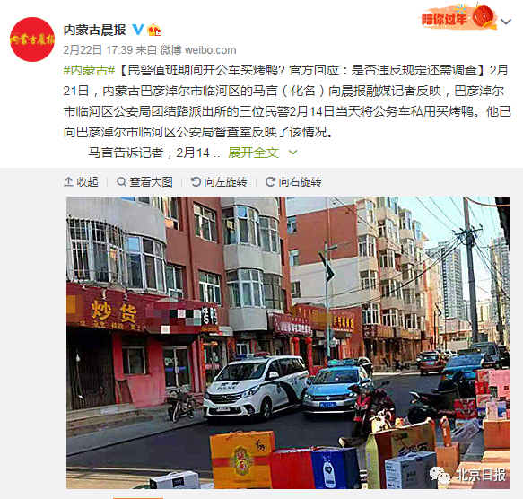 2月22日17时,内蒙古晨报发布报道《民警值班期间开公车买烤鸭?官方回应:是否违反规定还需调查》。