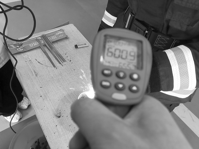 刘超瑜先在室内做了一组静态实验。在钢丝棉下方铺上报纸和毛巾,然后点燃钢丝棉,随即不断迸出火星,下方的报纸和毛巾被烧出小黑洞。
