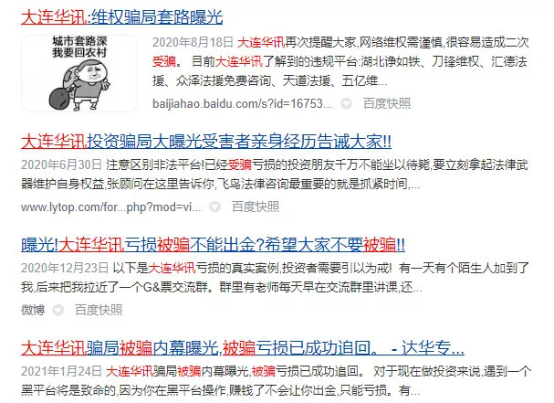 媒体查询发现,在网络平台上,大量网友投诉大连华讯公司,称其是“骗子公司”。警方透露,2017年至2020年期间,该公司因业务员不具备证券从业资格或违规荐股等行为,被全国多地证监局行政处罚。