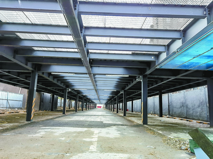 记者看到,小区的东西两个园区内分布有两个立体停车场,西区的停车场被一圈绿色围挡围了起来,围挡里钢结构的二层停车场已经完工,地面的停车线整齐划一,两侧安装着一盏盏照明灯,监控探头范围也覆盖到了整个停车场。