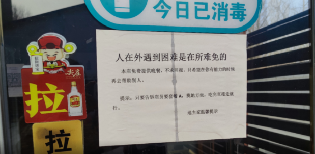在昌平区振兴路附近的地主家石板烤肉店门前,贴着一则温馨提示:“人在外遇到困难是在所难免的,本店免费提供晚餐,不求回报,只希望在你有能力的时候再去帮助别人。只要告诉店员要套餐A,找地方坐,吃完直接走就行。”