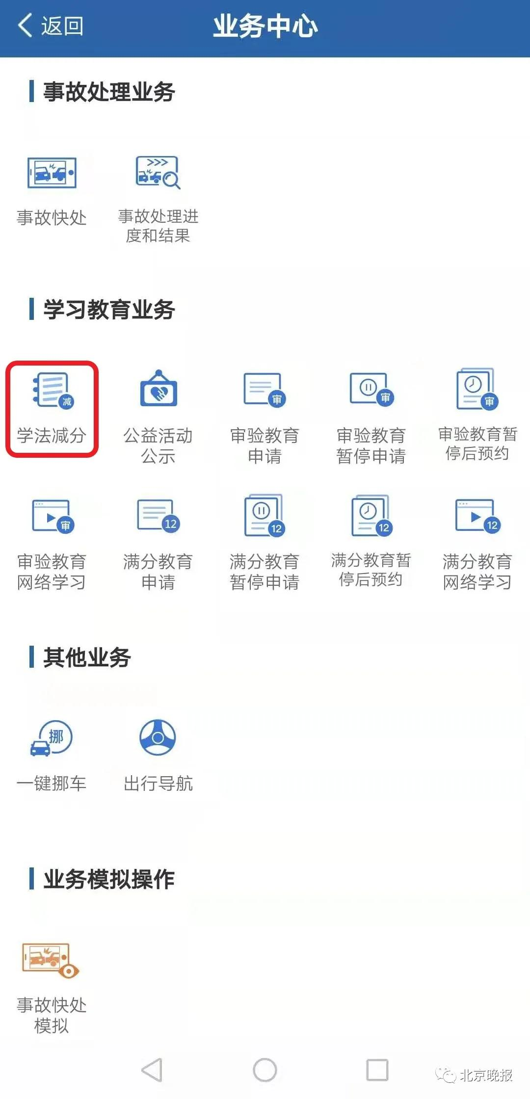 凡持有北京公安交管部门核发机动车驾驶证且符合申请条件的驾驶人,注册并登录“交管12123”APP,通过“业务中心”的“学法减分”模块,完成网上学习且考试合格的,一次可减免1分,一个记分周期内累计最高减免6分。本记分周期内有两次以上满分记录或者累计记分已达到12分等7种情形之一的,不予受理申请。