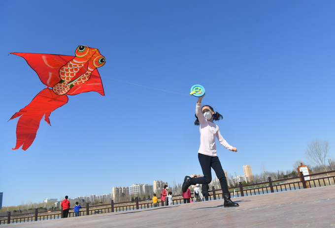 在永定门城楼前,记者看到不少市民在此放风筝,在蓝天白云的衬托下,色彩斑斓的风筝让前来游玩的市民兴致勃勃,心情随着风筝一同放飞。