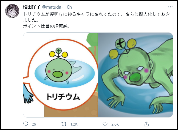日本漫画家松田洋子画出了她心目中的“氚吉祥物”。她发推称,我把复兴厅的吉祥物进一步拟人化了,精髓是眼睛的虚无感。推文获得数千点赞。