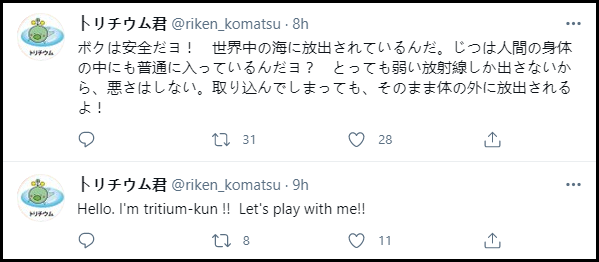 同时,推特上已经出现了名为“氚君”(トリチウム君)的“吉祥物账号”。该账号近日密集发布大量有关氚的安全性的推文。