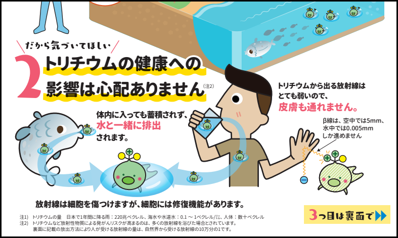 宣传材料中,氚以绿色小人的吉祥物形象出现,遍布人体内、自来水管道和生物界。复兴厅避重就轻地只介绍氚元素的性质,而不提核废水一旦排放会造成的其他污染。