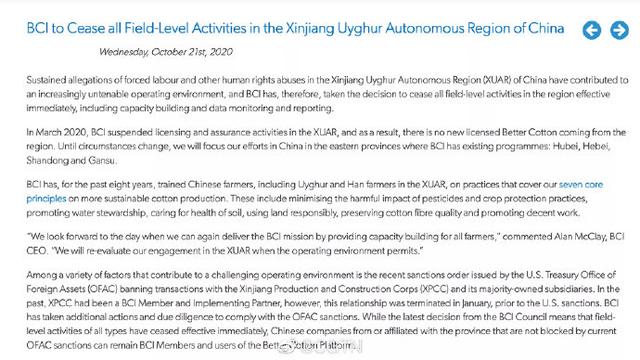 2020年10月,瑞士良好棉花发展协会(BCI)宣布对所有新疆棉企无限期取消担保认证,让新疆棉产品进入了国际贸易的“黑名单”。而在今年中国民众声讨并抵制BCI及H&M等会员品牌后,BCI偷偷下架了这份引起轩然大波的声明......