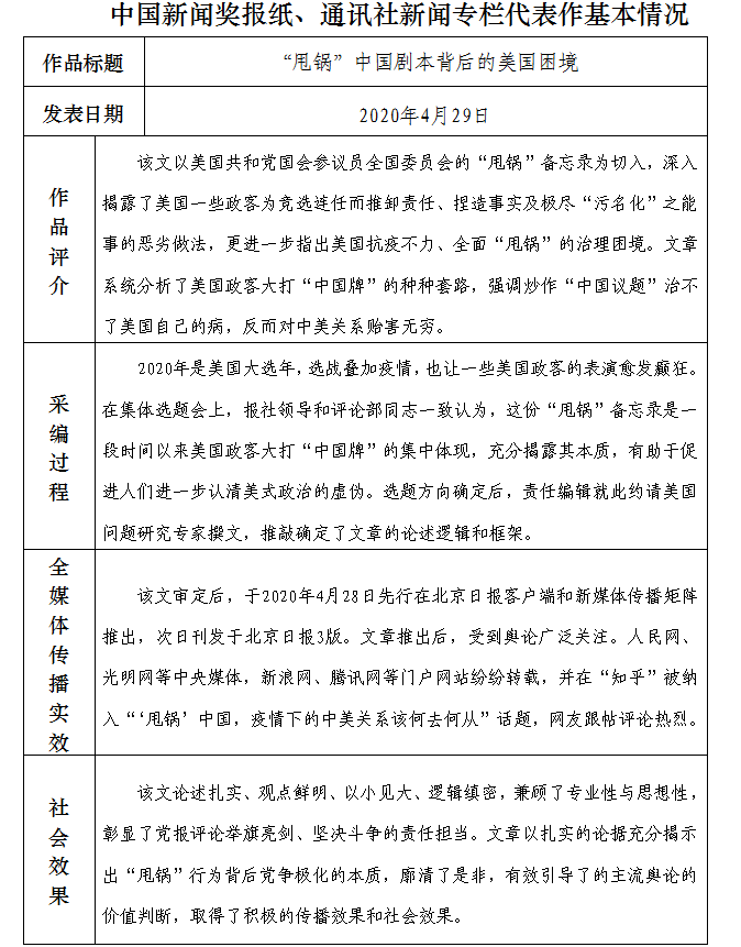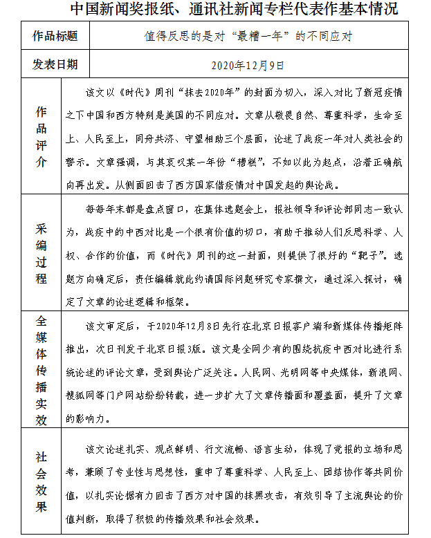 几年来,《学者观潮》专栏刊发了不少好的评论作品,其中《不要被各种“陷阱说”给忽悠了》和《俄罗斯“断网”测试的战略考量》两篇文章,分别得到习近平总书记批示肯定。此外,文章还多次获得中宣部和北京市委领导以及各级新闻阅评组的肯定和表扬,得到了新闻同行的高度关注和社内外读者的好评,为重要时政理论网站和主要门户网站广泛转载。2020年,该专栏针对疫情防控国际比较撰写的《“甩锅”中国剧本背后的美国困境》《值得反思的是对“最糟一年”的不同应对》,回击西方国家攻击抹黑撰写的《满身肮脏的美国不配谈“清洁网络”》《面对抹黑泼污该回击就要回击》,呼应经济社会秩序恢复撰写的《疫情之“危”激发中国经济之“机”》《核心指标转正彰显中国经济强大韧劲》等文章,均获得了广泛的社会影响。