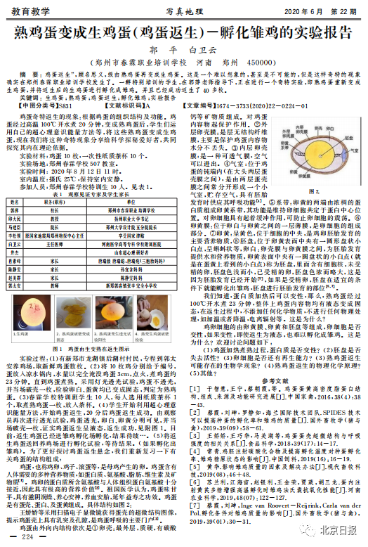 这篇论文在摘要中称,熟鸡蛋返生已经实验成功。为了研究返生后的鸡蛋是否具有生命力,郑州春霖学校郭萍老师、郭店鸡场郭太安老师及其他爱好者,密切关注孵化进程。最终成功孵化出新的雏鸡,提示熟鸡蛋返生后的鸡蛋同样具有生命力。