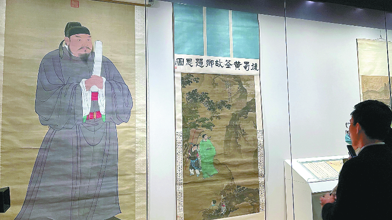 按此标准,从上古时期的尧舜禹至清代的康熙、乾隆;苏武、诸葛亮、岳飞、文天祥等文臣武将;王昭君、蔡文姬、木兰等伟大女性均在展出之列。其中,半数文物是首次展出。移步间,一直在和名人打照面儿:《清圣祖常服像》轴中,年轻的康熙相貌俊秀;《张飞像》轴中,张翼德豹头环眼,燕颔虎须;《武侯高卧图》卷中,诸葛亮偃卧竹林,意态潇洒;在《便桥会盟图》卷中,唐太宗李世民则是坐在马车里出场。