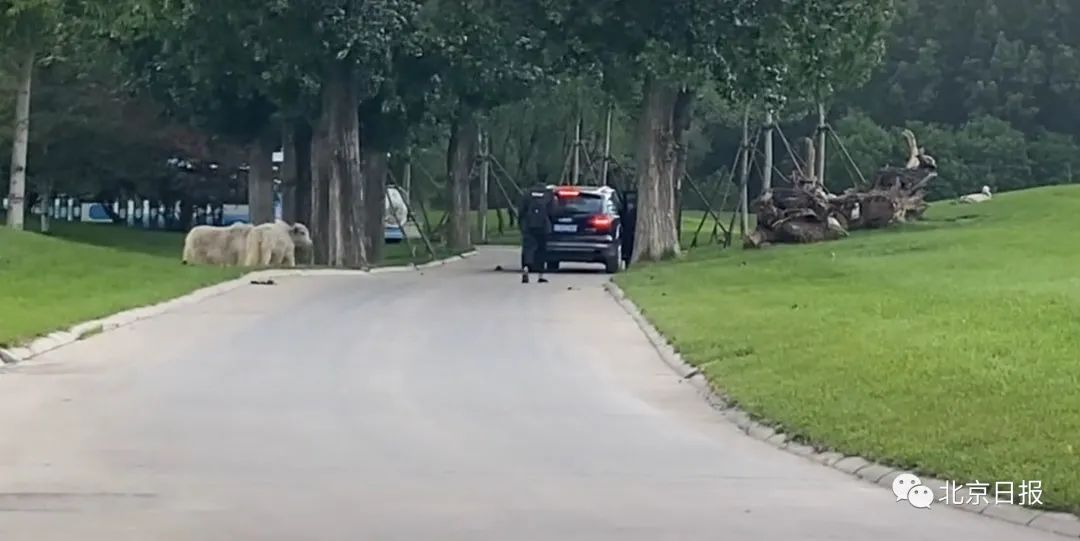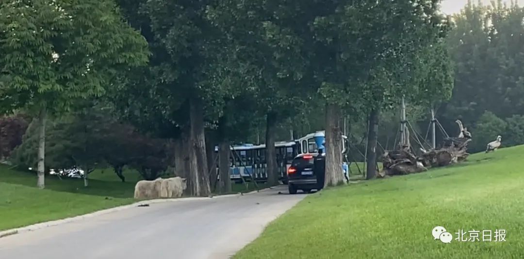 根据游客提供的信息和视频显示,事情发生在5月4日下午5时45分左右,在北京野生动物园自驾游览区,一辆黑色SUV 轿车停在路边,两侧的草坪上还有正趴着休息的牛和鸟类等动物。