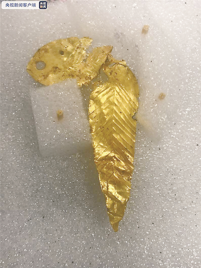 除石磬残片外,8号坑还陆续出土近60件尺寸、形态各异的金叶。据介绍,金叶呈脉状纹式,顶端有孔,可用于悬挂。可以确定,它们应该是挂在神树上的饰物。