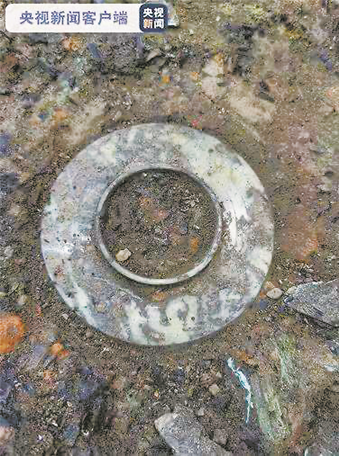 昨天,8号坑又成功出土一件有领玉瑗。有领玉瑗通体泛白色,玉瑗外径14厘米,内径7厘米。该器制作精工,平面为一规整圆形,中有圆孔,孔周缘有一圈凸起,璧面光洁,刻划有同心圆圈状弦纹。