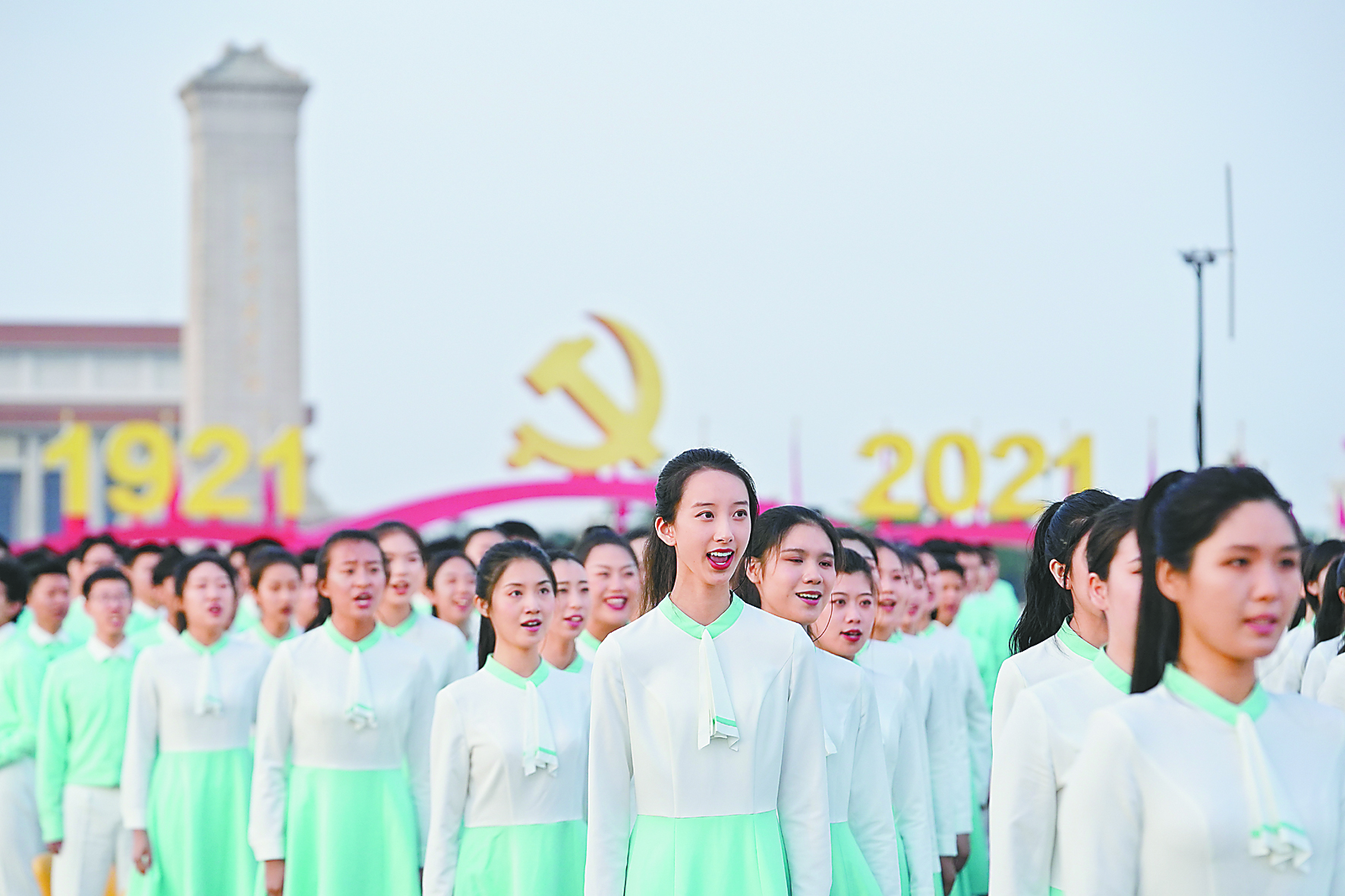 “唱支山歌给党听,我把党来比母亲;母亲只生了我的身,党的光辉照我心……”上午7时35分左右,天安门广场传出悠扬清澈的无伴奏歌声,这是歌曲《唱支山歌给党听》。童声之后,铜管乐器加入,引出女声二部合唱,最后,现场3000名合唱队员用饱含深情的歌声,抒发对党的热爱和祝福。